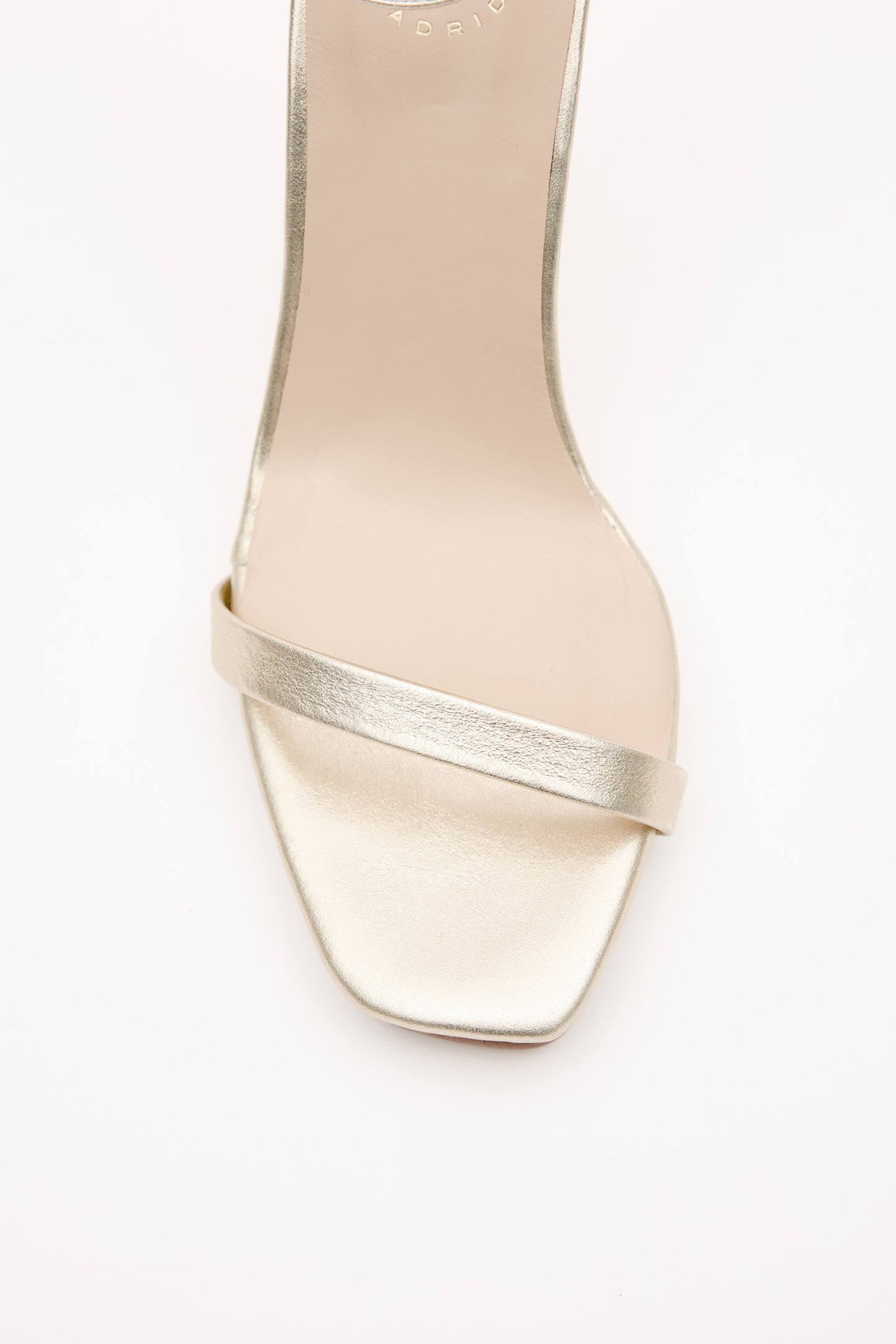 Leather sandals. Square toe open toe. Thin strap on the front. Covered heel. Thin strap fastened at the ankle. Heel height of 10,5cm. Platform 1,5cm.