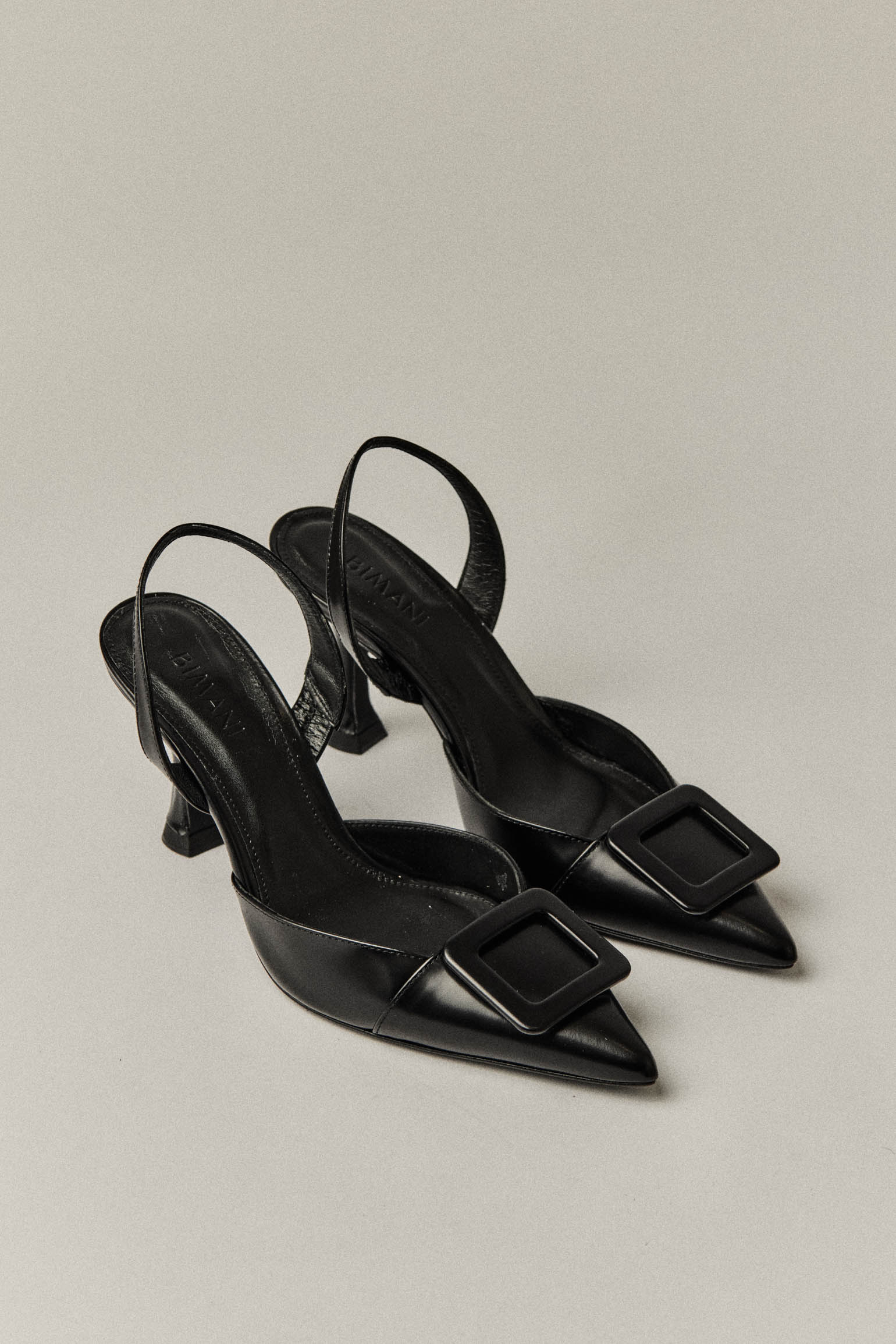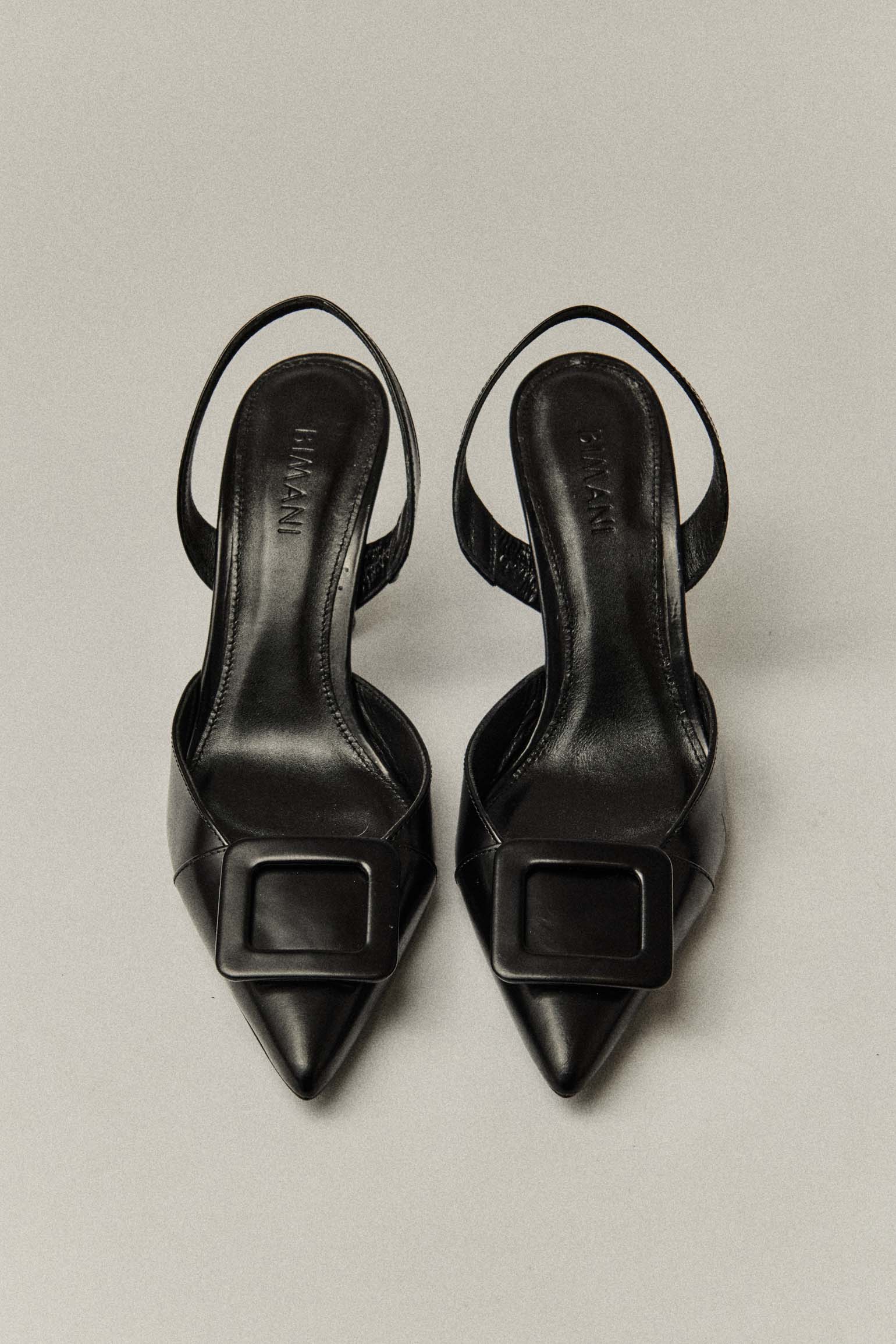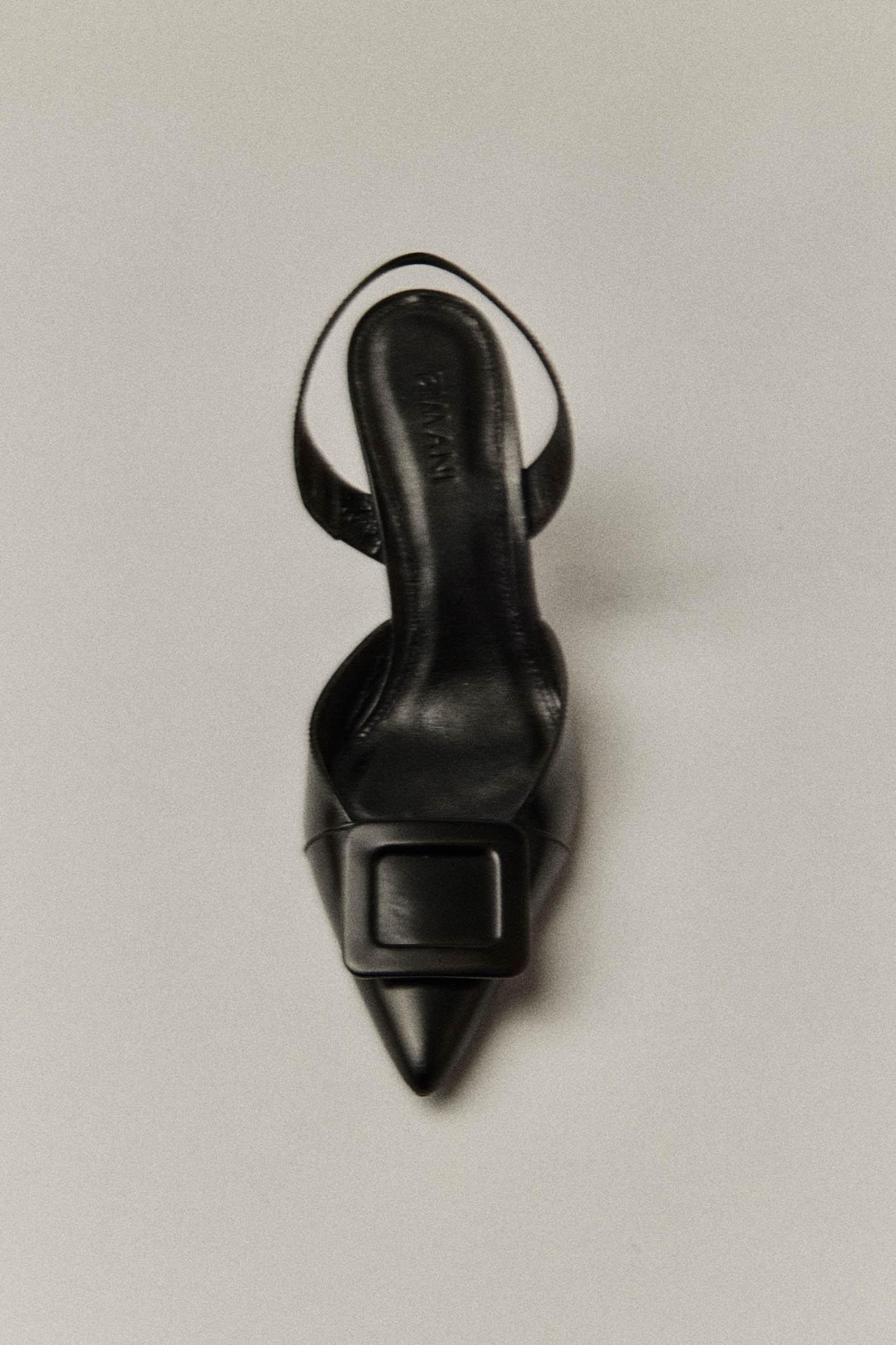 It features a slingback design, a pointed toe, and its iconic tone-on-tone covered buckle. Now with a new shape and hourglass heel for greater comfort. The design includes a side adjustable strap for greater comfort and support.