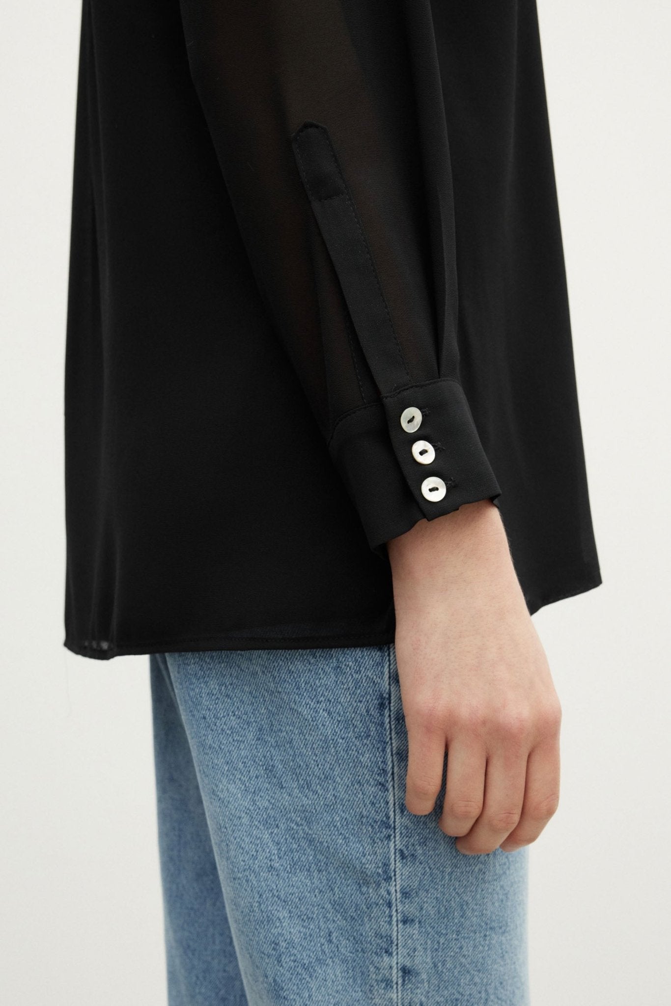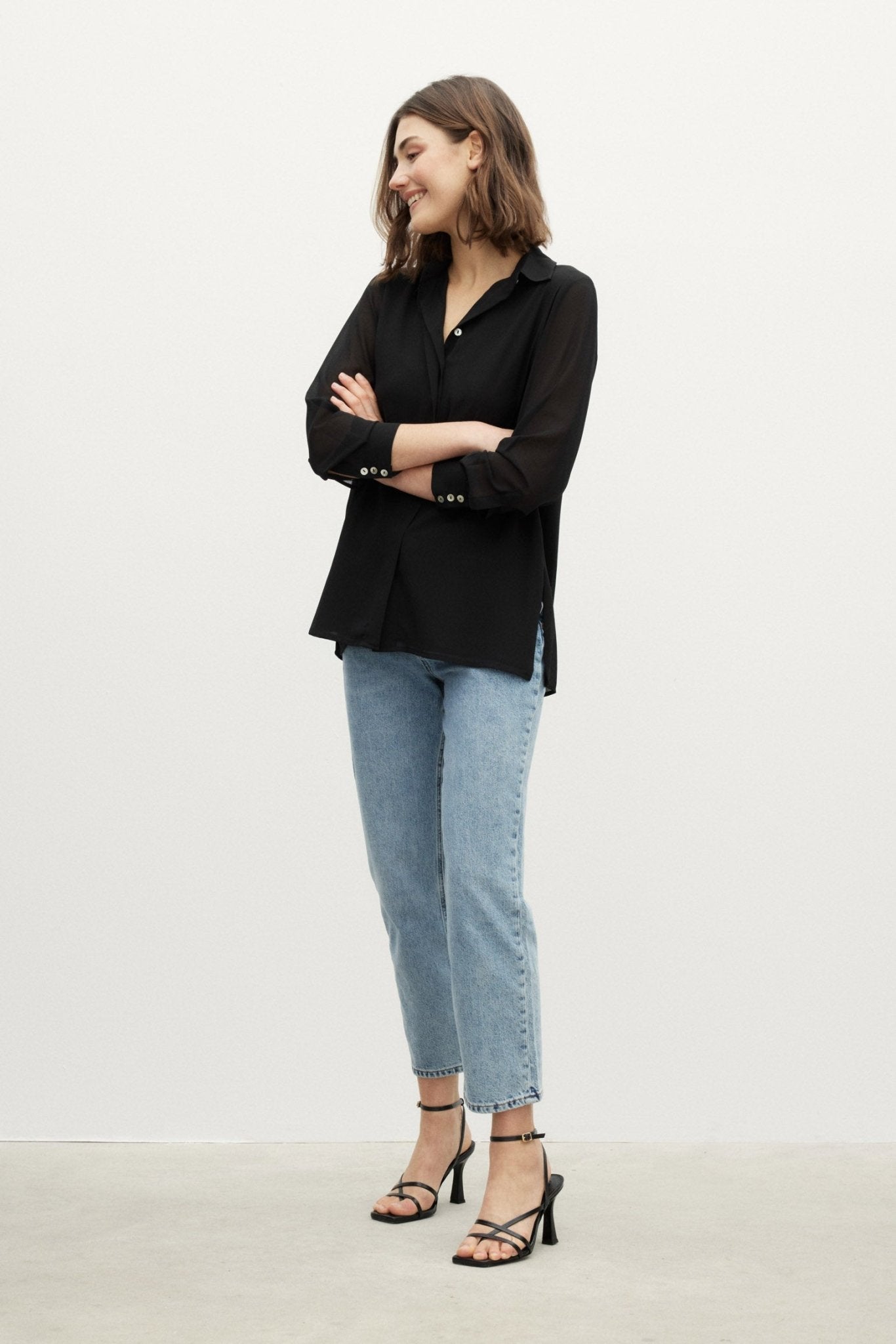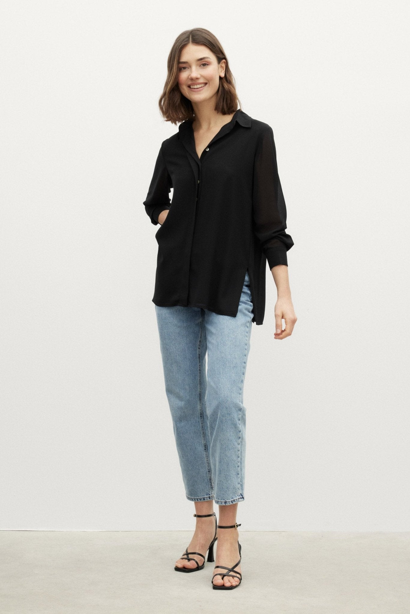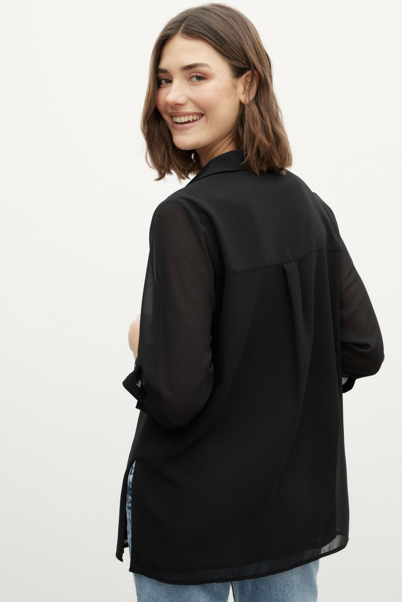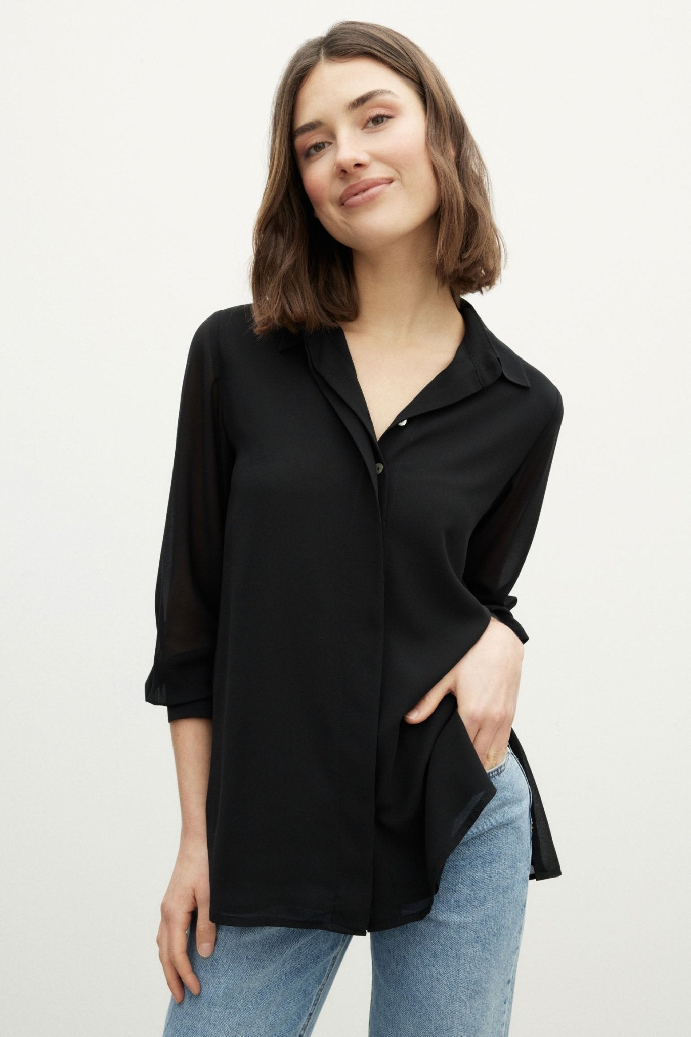 La blusa ESENCIA, en color Negro Magnético, es un clásico sartorial modernizado por BIMANI bajo un prisma de versatilidad y sofisticación.