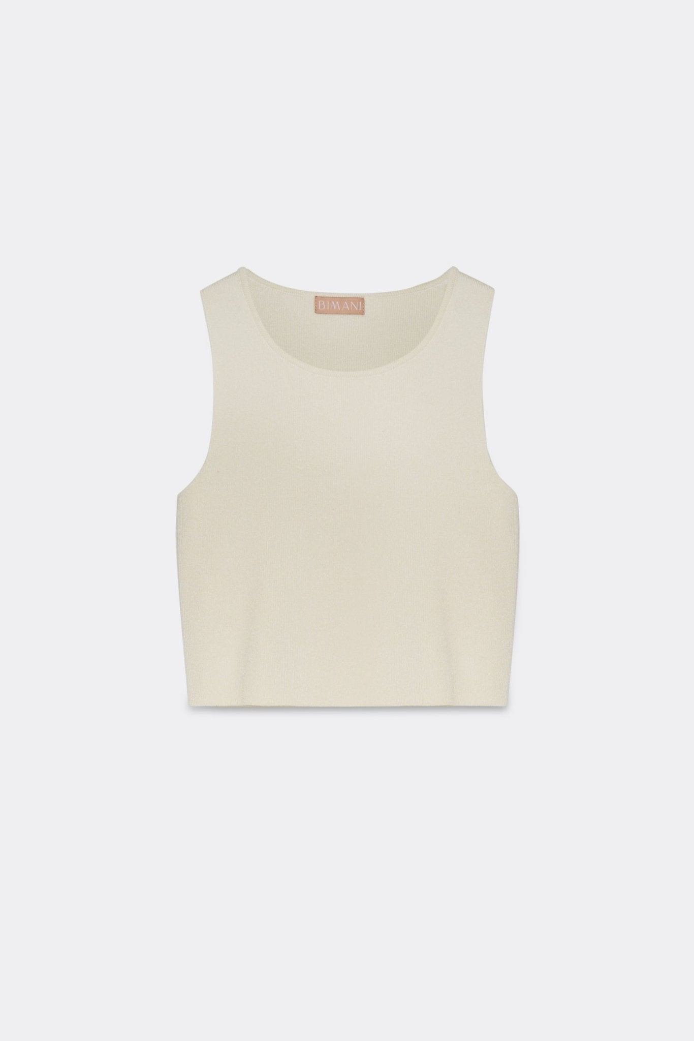 - Top de punto liso ceñido. De talle corto y escote redondo con acabado tubular. Acabo limpio con menguado en sisas y bajo.