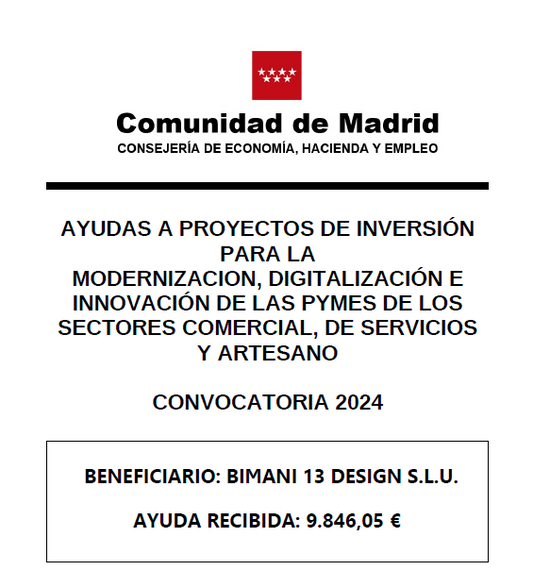 BIMANI 13 DESIGN, S.L.U. ha llevado a cabo el proyecto con título “Desarrollo y actualización de las soluciones tecnologías de BIMANI para mejorar la logística, las ventas, la gestión de la información, el servicio y reducir el impacto medioambiental” financiado por el Ministerio de Industria, Comercio y Turismo, con una subvención de 17.685,00 €. Este proyecto encaminado a la transformación digital de la empresa, a través de la