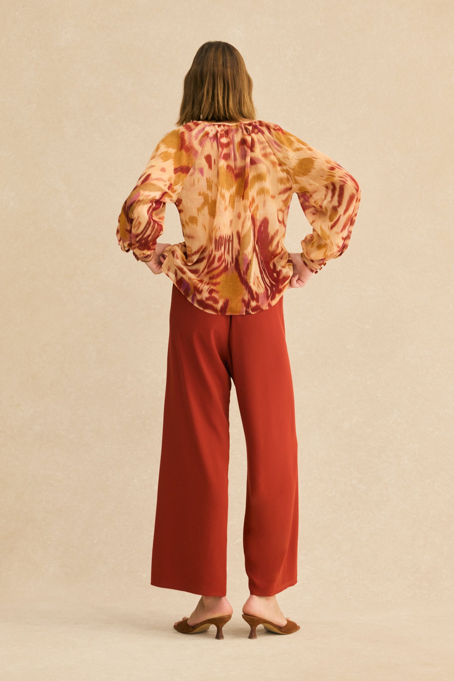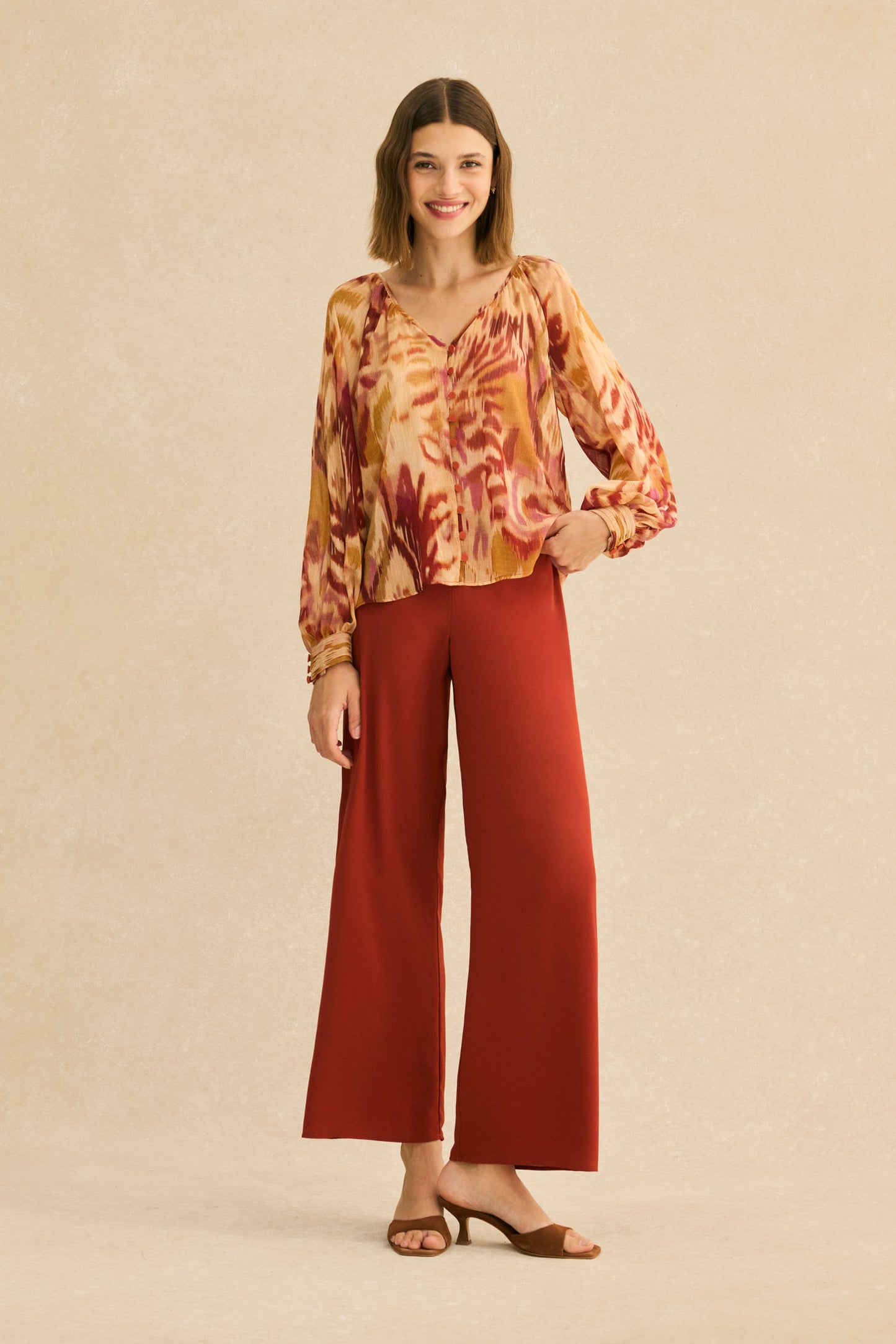Pantalón de tiro alto y goma en la espalda, largo tobillero y corte recto amplio.