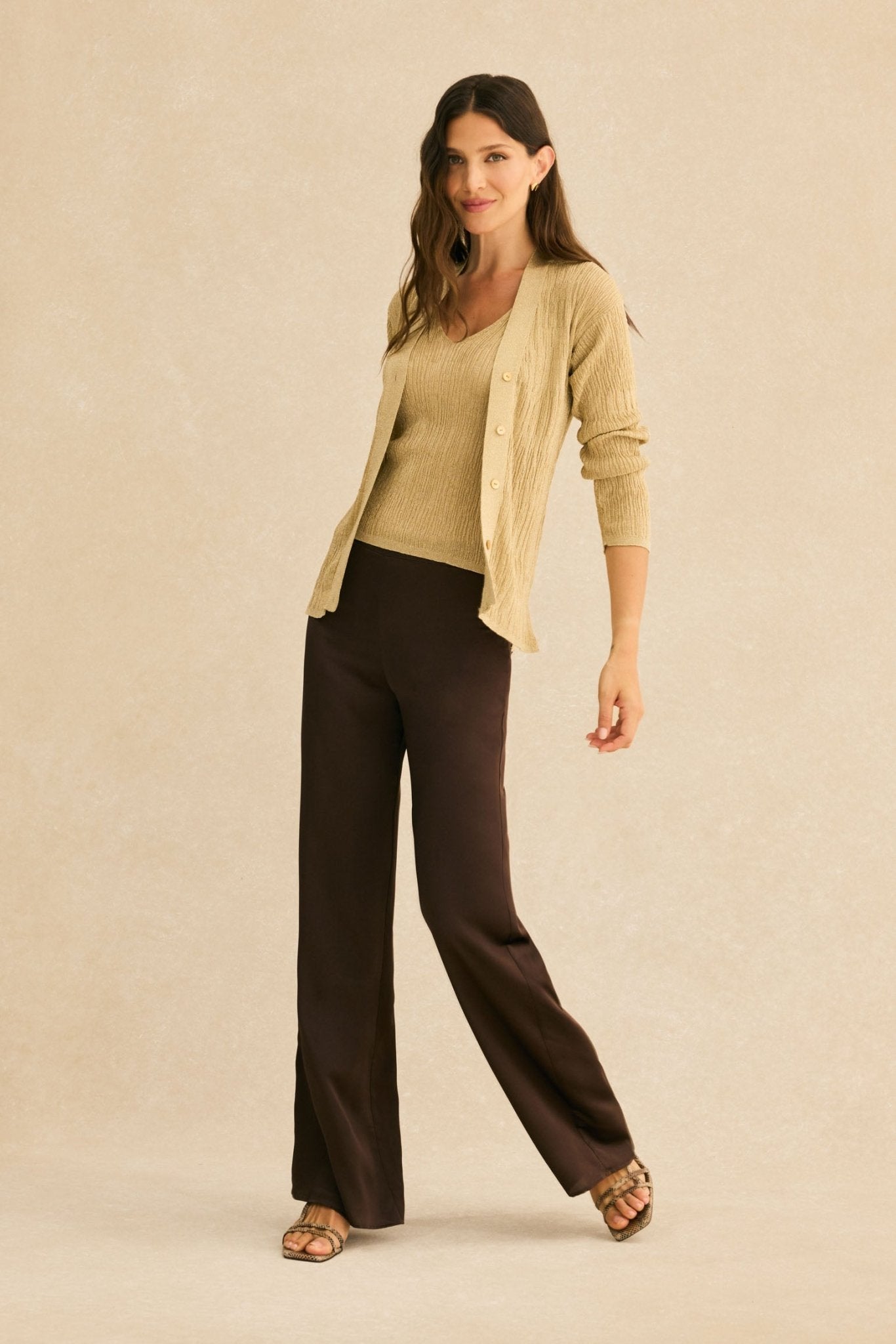 Pantalón de tiro alto y goma en la espalda, largo maxi y corte recto.