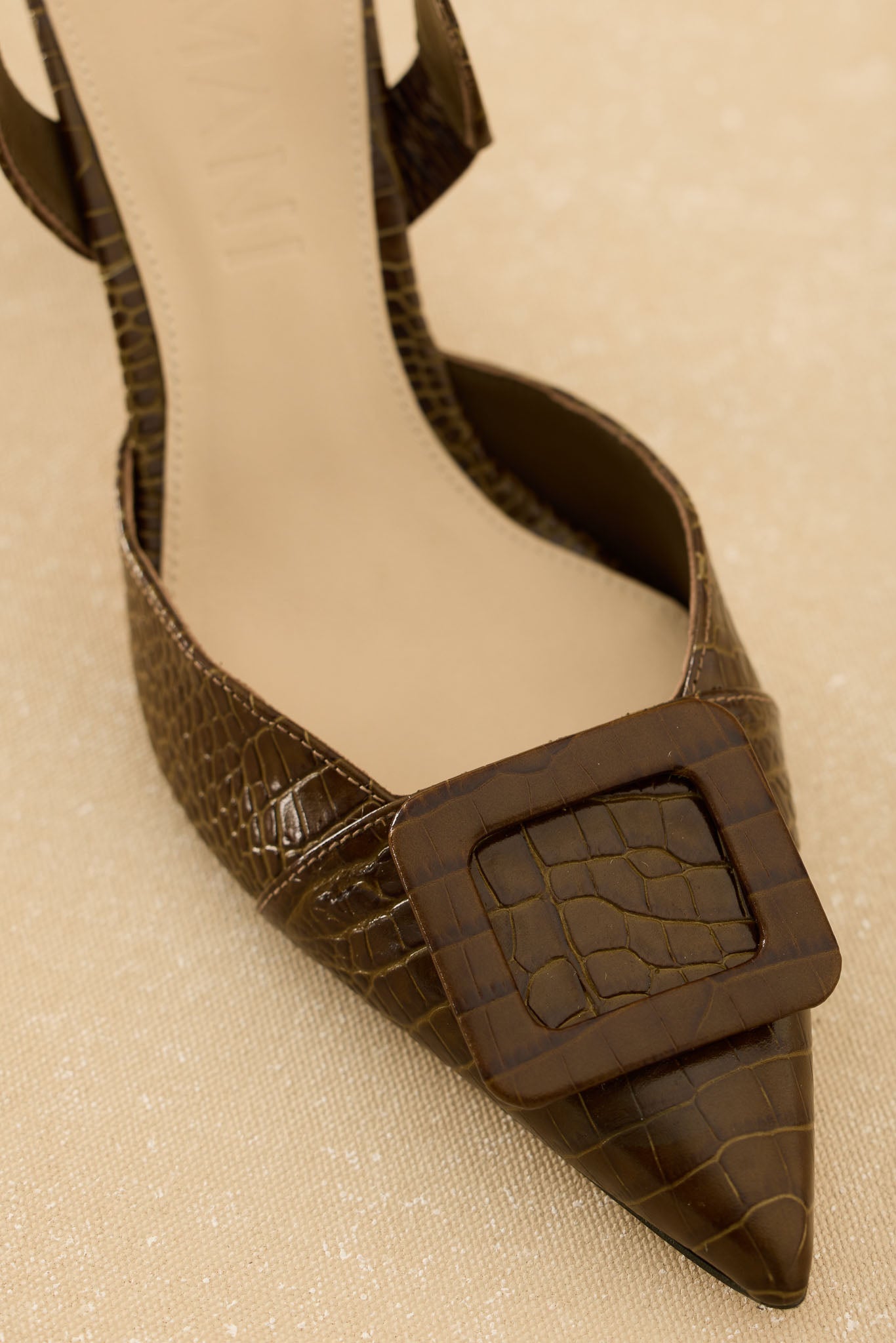 Tiene un diseño destalonado, punta fina y su icónica hebilla forrada al tono. Ahora con una nueva horma y tacón en forma de reloj de arena para aportar un mayor confort. El diseño incluye una tira con ajuste lateral para mayor comodidad y sujeción.