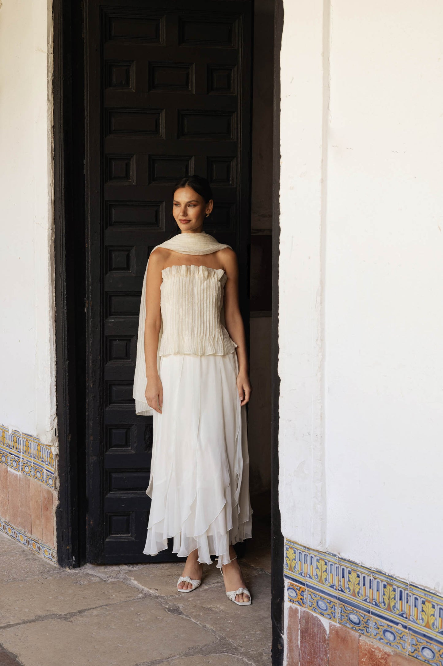 Combínalo con una falda que incluya su tono o del mismo y termina tu look con accesorios y joyas, dando protagonismo a los pendientes o un chocker.