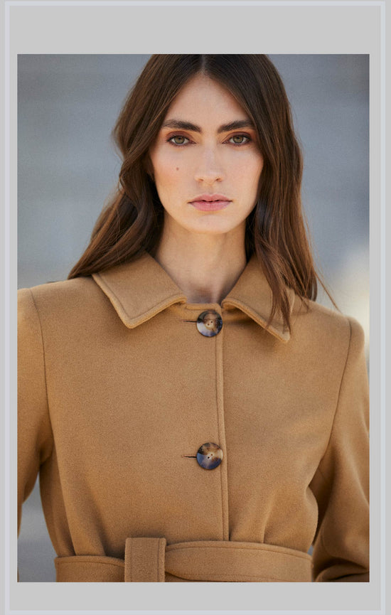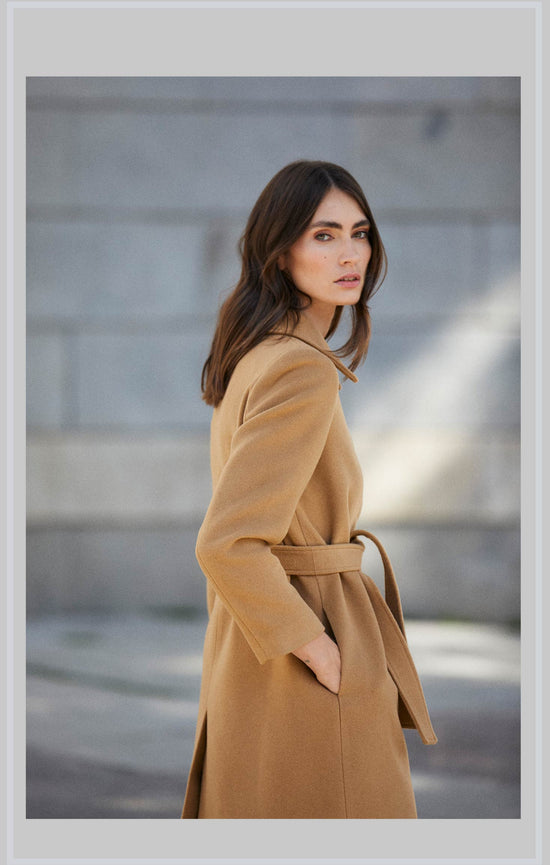 Calidad y exclusividad, nuestro abrigo PRADO. Diseñado en corte recto y cuello camisero con un cinturón extraíble para ensalzar la silueta.