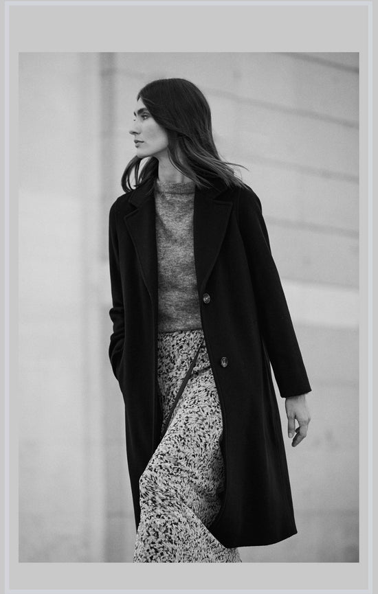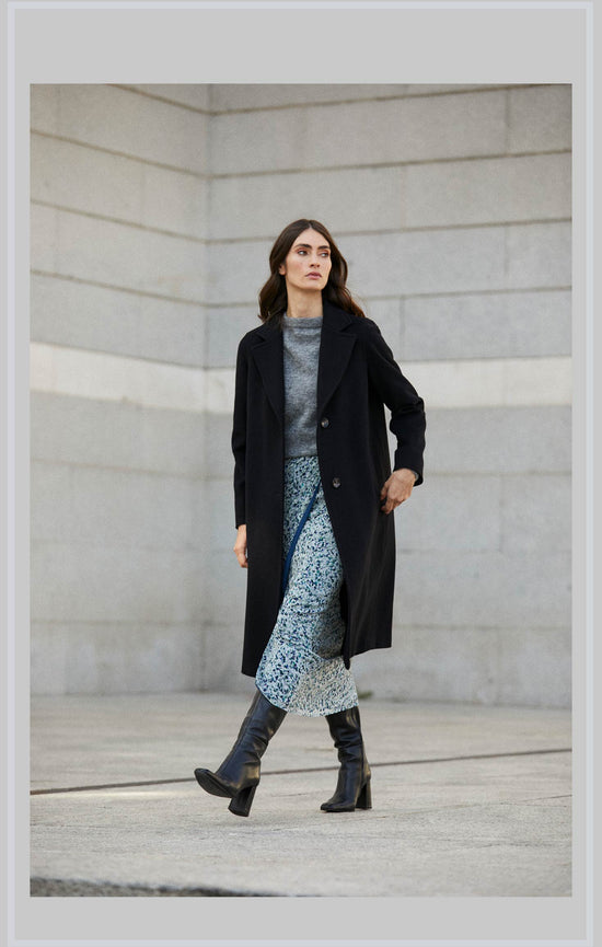 Nuestro abrigo de corte recto, largo midi y cuello solapa. Diseñado y confeccionado en España con una composición de 70% lana y cashmere.