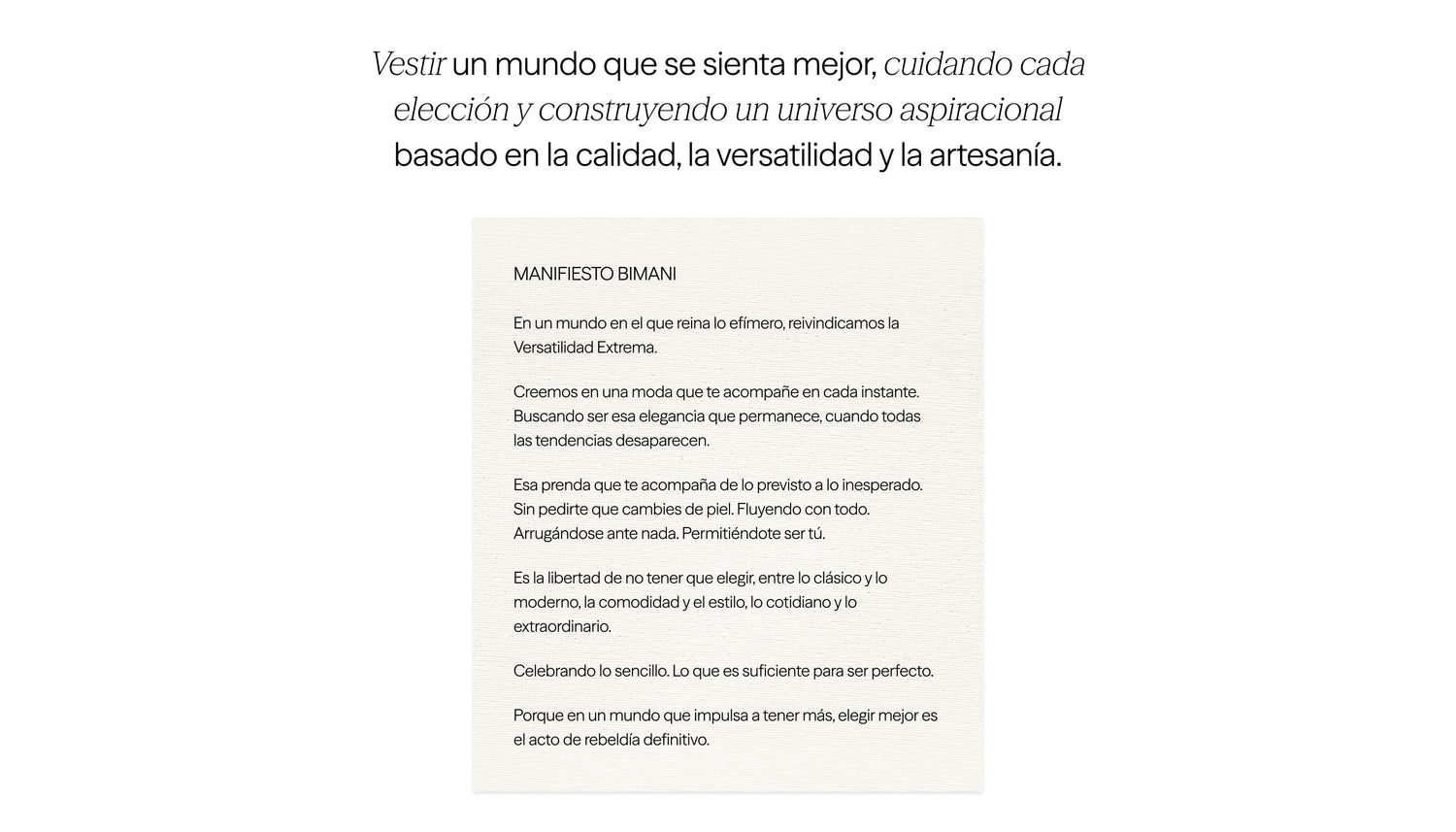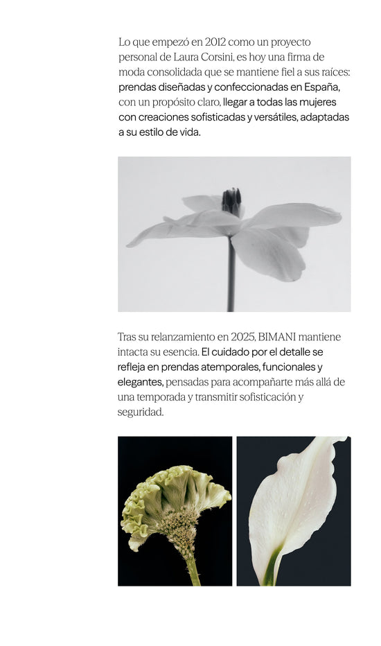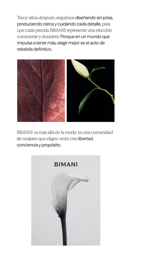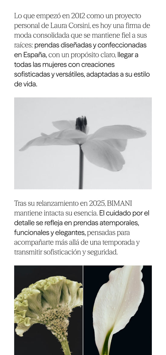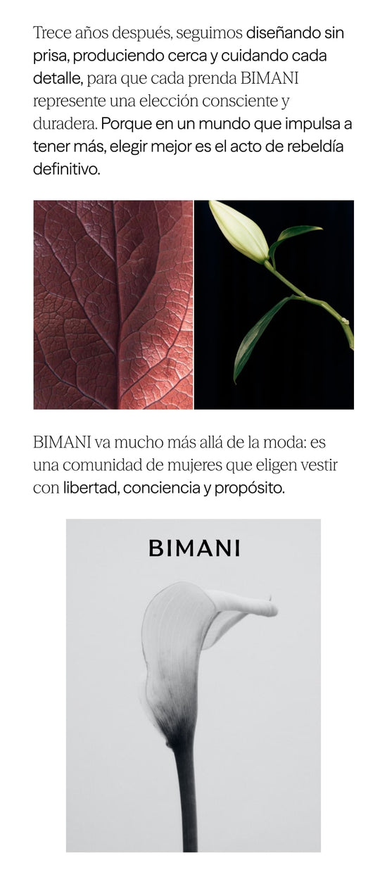Prendas confeccionadas en España con nuestro tejido BIMANI. Un crepe georgette de alta calidad, con un acabado vaporoso y elegante, diseñado para ofrecer una caída impecable. Diseños atemporales, prácticos y favorecedores. Una colección versátil, en una amplia variedad de colores, y de cuidado sencillo, que no requiere planchado, lo que lo convierte en una opción ideal para el ritmo del día a día.