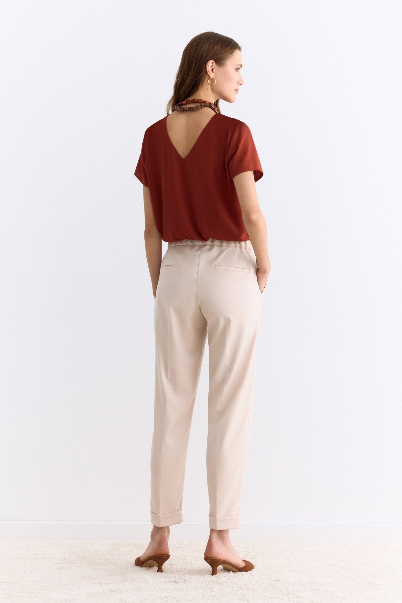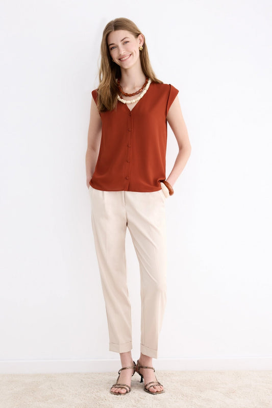 El pantalón NAJAC, de inspiración sartorial, es un pantalón de traje con pinzas y bajo con vuelta inglesa. Su confección en tejido sarga irradia sofisticación y naturalidad.